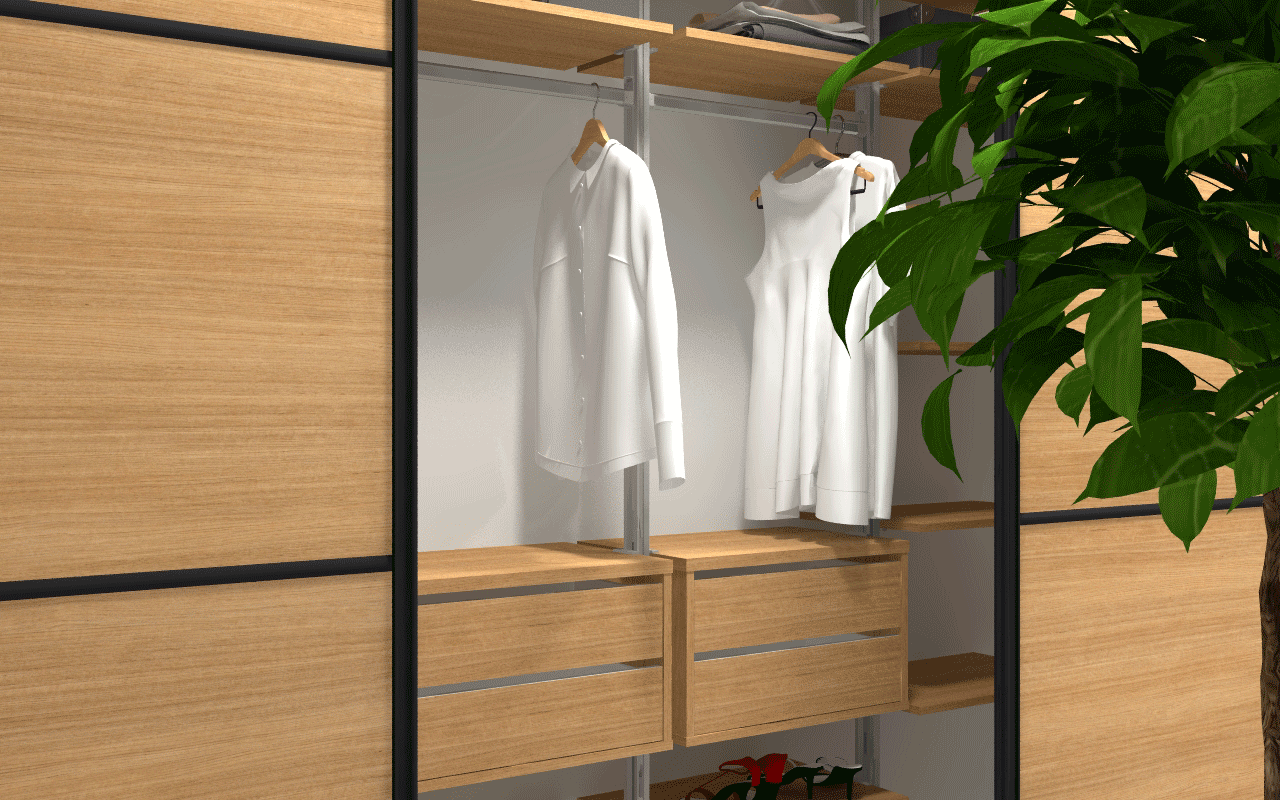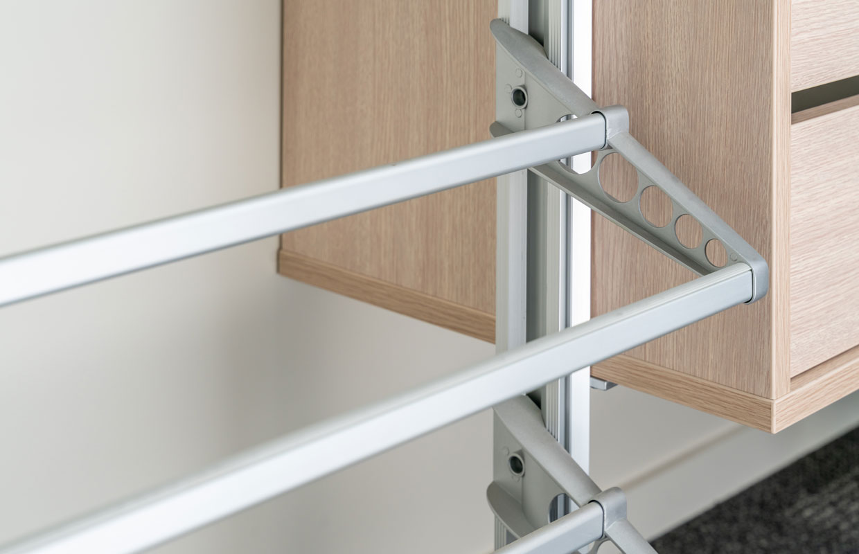 Discover an industrial chic alternative to your usual wardrobe organiser. Sleek metal stanchions create a minimalist look that can add class to any space.